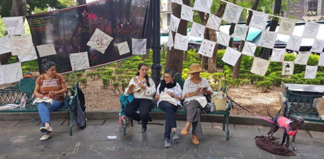 hacer una acción colectiva que respondiera a la necesidad de hablar de las víctimas como vidas irremplazables versus ‘daños colaterales’, como no quedarnos inmóviles y en silencio, como afrontar la muerte y el dolor de una sociedad en proceso de deshumanización. Entonces atendimos al llamado de rescatar la memoria, primero escribiendo con gis los nombres de las víctimas de la violencia en el piso del parque, apoyándonos en la base de datos de Un día menos aquí. Sin embargo, no fue suficiente, así que, en nuestras reuniones, llegamos a la idea de nombrar a nuestros asesinados con el bordado zapatista que funciona como cimiento de difusión de su pensamiento; esta fue la urdimbre en la que surgió Bordando por la Paz y la Memoria. Una Víctima, un Pañuelo. En agosto de 2011 [...] salimos a la calle a bordar; ahí fue cuando dimensionamos la importancia de nombrar a nuestros muertos con hilo y aguja junto con la ciudadanía de a pie, retomando el espacio público, el lugar que pertenece a todos. 13