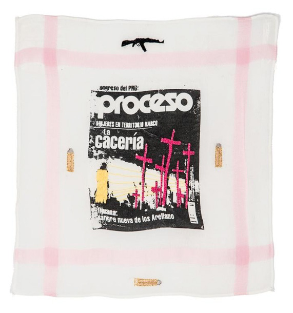 Cortesía de Mónica Iturribarría.En los pañuelos de 1/40 000 ante el dolor de los demás no hay engaño: la tensión es inmediata, uno ve la portada al mismo tiempo que sabe que se trata de un pañuelo. Los dos objetos pertenecen a dos esferas que se rechazan y no quieren encontrarse. El papel periódico, anónimo, sucio, público, barato, trae las noticias de la calle y del afuera. La tela limpia, herencia familiar de algodón blanco sólido, acompaña, consuela, evoca la casa, la intimidad y la pertenencia. El nombre del periódico nos avisa, el título confirma que son noticias terroríficas. La imagen a blanco y negro es tétrica: una mujer sola frente a una decena de cruces rudimentarias de unas tumbas recién cavadas, un cementerio improvisado en la urgencia de las muertes acumuladas. Coloreadas con hilo rosa por la bordadora las cruces son tumbas de mujeres, frente a ellas una sobreviviente solar, bruja que ha logrado librarse por el momento, testigo de pie frente al horror. Los motivos bordados alrededor de la imagen pertenecen al campo militar y guerrero: balas, hermosamente bordadas en hilo dorado, un arma Bushmaster .223 muy precisamente bordada en hilo negro. Con sus bordes de color rosa pálido, el pañuelo es para una mujer. ¿Quién puede tener la insolencia de bordar esto? Una bordadora loca, por supuesto. Una bruja. El carácter herético y provocante de sus bordados evocan un talismán; Hunter nos recuerda que tradicionalmente los textiles bordados son cargados de propiedades protectoras, desde el poder de las plantas de las que provienen hasta los bordados que se vuelven una suerte de escudo contra los peligros. 23