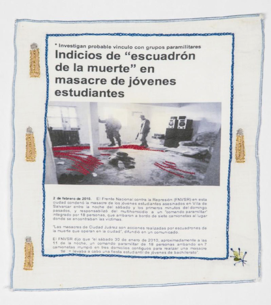 En su obra Escuadrón de la muerte la imagen del artículo impreso se compone de una foto y de un texto claramente legible. La tela toma el relevo del papel y extrae al lector de su rutina de consumidor de noticias. El gesto de Iturribarría permite también volver a visibilizar los detalles del trabajo periodístico. A medida que la violencia se ha hecho parte de nuestra vida cotidiana el vocabulario de ciertos periodistas se ha dejado contaminar por la jerga administrativa en una suerte de puesta a distancia. Me pregunto si la elección de palabras corresponde a una exigencia de objetividad que resulta en una indiferencia salvaje o si revela el desconcierto de los periodistas frente a la inmensa dificultad de encontrar las palabras justas. En Facebook Abigail y Danae, bajo el nombre de La Corregidora, se dan la tarea de corregir los títulos y artículos de periódicos en su elección de vocabulario cuando tratan de feminicidios. Sus correcciones muestran claramente el carácter tendencioso del vocabulario en estos casos: el asesinato es descrito como un crimen pasional, una violación se vuelve un “infortunio”, etc. En los últimos diez años los fotógrafos y periodistas de prensa se han enfrentado a situaciones en las que han tenido que improvisar una práctica inédita de su profesión. ¿Cómo mantener la cordura frente al dolor de los demás? Una, frente a cuarenta mil muertos, una, frente al campo devastado de una batalla sin causa ni rumbo. Una, mujer lúcida, sigue ocupada con sus tareas cotidianas, aunque no como antes. Los detalles del bordado alrededor de la foto nos muestran esta transformación de una cotidianidad banal, del exterior del pañuelo, a una imposible de ceñir, subrayada por los hilos rojos que figuran la sangre. En la esquina inferior derecha una florecita de las que se suelen bordar en los pañuelos, un adorno sin consecuencia más allá de volver personal un objeto manufacturado. Pero en la esquina opuesta, ninguna flor: una bala, dos balas, tres balas.