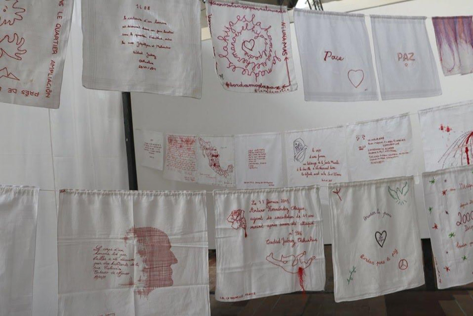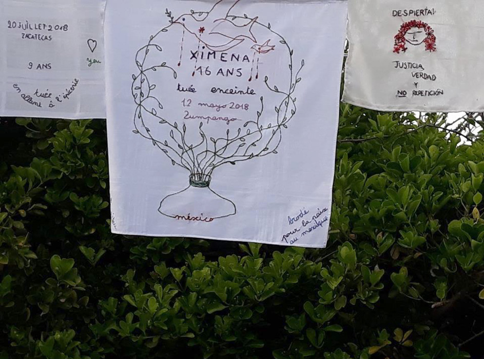 Cortesía de Mónica Iturribarría.A partir de este proyecto Iturribarría crea la asociación Bordando por la Paz en Oaxaca, reiterando el gesto del colectivo Fuentes Rojas. Me emociona y me conmueve profundamente que su trabajo se pueda mostrar en Francia. Vivo una suerte de retiro de la agitación del mundo, en una pequeña isla del oeste, en el Atlántico. Ahí, en este ambiente que valoriza los saberes tradicionales, conozco a bordadoras muy experimentadas. Les platico de la convocatoria, les explico la situación por la que pasa México desde 2006. Aceptan que bordemos juntas. Nos reunimos durante un poco más de un mes, cada semana, en el taller de Mélanie, que tiene un estudio de costura en el que imparte talleres de todo tipo de trabajos con aguja. Recibe a costureras principiantes y experimentadas, y a algunas (pocas) bordadoras. Es un espacio cálido y luminoso donde se escuchan muchas risas y se tejen lazos muy benevolentes entre mujeres de todas las edades y rumbos de la sociedad. Es el primer lugar donde socialicé en la isla. En lo profundo de mi dolor por la pérdida de mi madre y por la inmensa nostalgia de México llegué a este taller porque necesitaba ayuda en mis gestos de bordadora principiante y autodidacta. Encontré una comunidad de mujeres solidarias, hábiles, con un sentido del humor pícaro y una gran inteligencia. Con ellas empecé, puntada tras puntada, a regresar a la superficie de la cotidianidad. Ya llevo cuatro años en la isla y sé lo que pueden escuchar. Aun así, cuando empecé a contarles los casos que escogí para que bordáramos sus historias en los pañuelos me puse a temblar .Eran las historias de Giselle, de 11 años, violada y asesinada en Chimalhuacán en enero de 2019; de Ximena, de 16 años y embarazada, asesinada en Zumpango el 12 de mayo de 2018; de Ana Lizbeth, de 8 años, secuestrada y asesinada en Juárez, Nuevo León, el 15 de julio de 2018; de Jenifer, de 16 años, asesinada en Iztapalapa el 16 de marzo de 2019; de San Juana, de Zacatecas, de 9 años, asesinada de camino a la tienda. Recuerdo el momento de emoción tangible en este taller donde solíamos reír mucho. Empezaron por decir que bordarían en sus casas, porque esto era muy fuerte y algunas tenían hijas de la edad de las muertas. Empecé a trabajar en mi pañuelo mientras platicábamos. Pronto todas estábamos concentradas bordando el horror y, pronto también, comenzamos a abrirnos y hablar de otras cosas. Pero sí recuerdo nítidamente que nos contamos secretos, que fueron horas intensas de mucha cercanía y que teníamos mucha impaciencia de volvernos a ver, a escuchar, a acompañar, entre una sesión y otra. Mandamos los pañuelos a tiempo. Ellas también se conectaban por medio de sus propios duelos a los duelos de las familias de México.