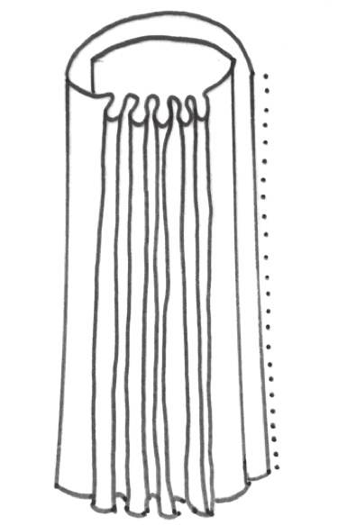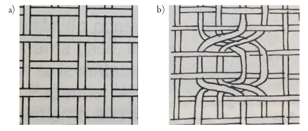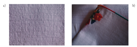 El huipil conocido como “tradicional” es una pieza conformada por dos lienzos largos simétricos de algodón blanco, tejidos en telar de cintura (Img. 7), 35 que se obtienen al cortar por la mitad la tela resultante de un telar de aproximadamente cuatro metros de largo. El huipil puede estar elaborado a partir dos tipos de ligamentos que producen dos tipos de textura en los lienzos: por un lado, están los elaborados con tejido sencillo, tafetán sencillo o tejido a la plana (Img. 8); 36 por otro lado, podemos encontrar huipiles elaborados con un ligamento nombrado en zapoteco sab bchadj (Img. 9). 37 A esta segunda forma de ligamento Ruth Lechuga la llama gasa, 38 por ser una técnica que permite producir un tejido delgado y ligero parecido al encaje.