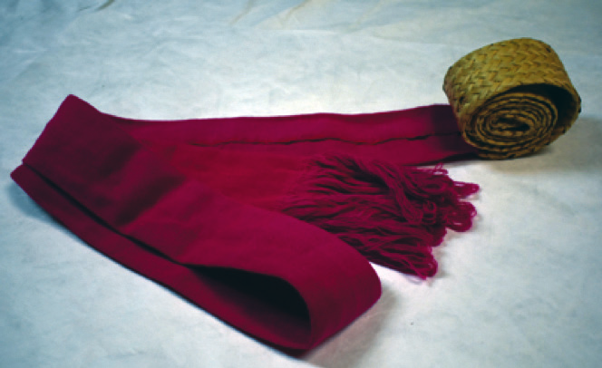 Pieza del acervo textil del INPI. Le acompaña la siguiente descripción: “Faja tejida en telar de cintura. Acrílico y palma en color rosa”. Tiene315 cm. largo × 9 cm. ancho y su número de inventario es 7626.