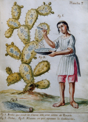 Por último, en lo referente a las lacas rojas, debemos hablar de la cochinilla. Esta “rica y gruessa mercadería” 77 se extraía de los insectos recogidos en las tunas americanas y una vez secos se embarcaban rumbo a la Península. Este tráfico que tanto beneficio aportó a las arcas españolas comenzó ya en 1543 por mandato del emperador Carlos I, llegando a partir de entonces “regularmente de México y Honduras en cantidades considerables, que van en aumento a medida que avanza el siglo: 4.080 arrobas en 1569, 4.153 en 1576, 13.285 en 1584 y en 1587 llegan a ser, traducido a kilos, unos 65.000”. 78 Pues bien, la cochinilla también se crió ampliamente en la región de Boyacá, lo que pudo redundar en su uso como pigmento: