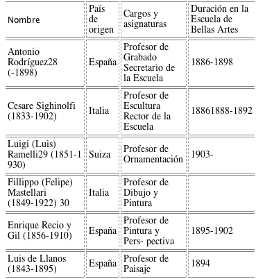 La falta de docentes especializados fue un problema en todas las áreas del conocimiento en Colombia durante el siglo xix; por tal razón la Ley 122 del 23 de diciembre de 1890 autorizaba al Gobierno para contratar y traer de Europa o de los Estados Unidos, “en caso de que se juzgase necesario o conveniente, los profesores que para las asignaturas en la Universidad Nacional no se encontraran fácilmente en el país”. 27 Esta normativa permitió la llegada de especialistas internacionales para la promoción del conocimiento de las artes y las ciencias en Colombia. En el caso de las Bellas Artes, esta fue la ventana que permitió subsanar la carencia de docentes y también la herramienta empleada para poder dar inicio a las obras públicas propias del periodo regeneracionista.