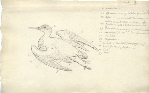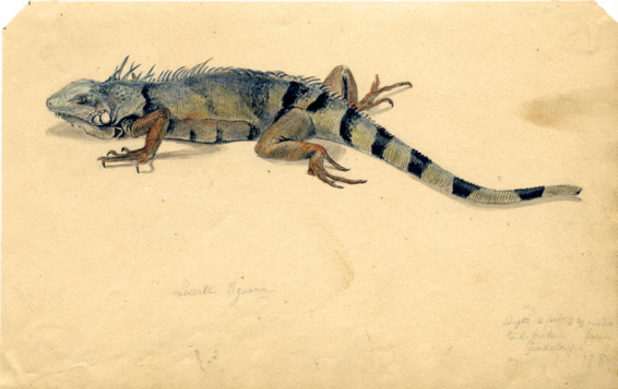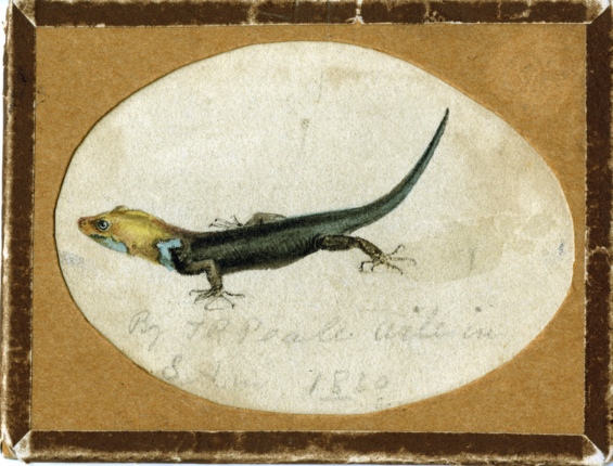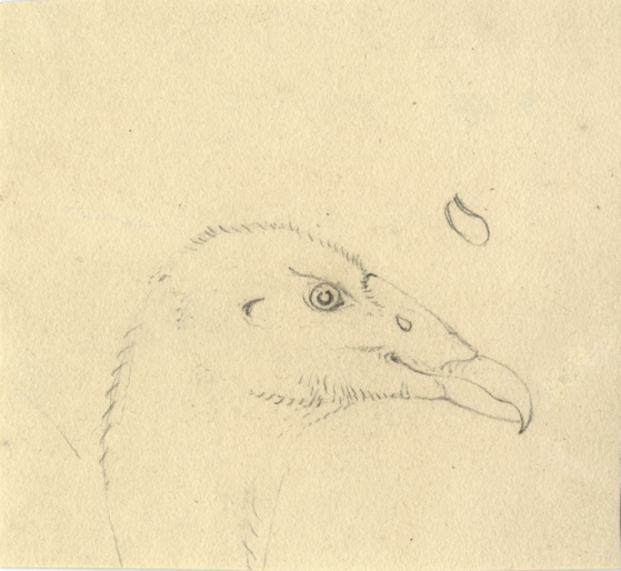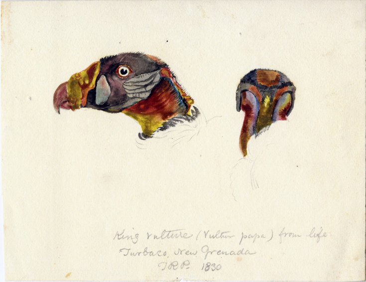 American Philosophical Society.The iguana is beautifully detailed and includes a shadow, which differentiates it aesthetically from the grasshopper, although the function of both is clearly taxonomical. The small lizard is drawn on paper that has been glued to a thick cardboard surface, as well as framed by a paper oval frame. Other drawings include a pencil diagram of an unidentified bird (Img. 11) and a pencil sketch of a king vulture’s head (Img. 12). When this item was originally examined in 2018, it was found in a folder that the APS had assigned to material from Colombia; when the material was consulted again in 2020, the same drawing had now been now in a folder of undated drawings and titled New World Vulture. 44 The sames pecies is depicted in another pencil drawing, hand-colored with watercolor and presenting two other viewpoints of the vulture’s head (Img. 13). Although according to Witmer Stone this species of bird, Cathartes burrovianus, was named after Marmaduke Burroughs, 45 Peale himself inscribed the drawing in pencil with the words: “King Vulture (Vultur papa) from life, Turbaco NewGrenada, TRP, 1830.”