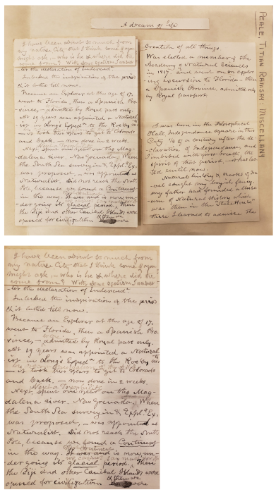 In the fall of 1830, Titian Ramsey Peale was working as curator of the Philadelphia Museum when he left for this trip (which was expected to last one year) 10 in the company of English artist, architect, and explorer Frederick Catherwood 11 and of William McGuigan, a taxidermist from Philadelphia who later also joined the Wilkes Expedition (Img. 1). The APS holds a document that reveals information regarding at least one of his companions: a handwritten fragment on two pieces of paper of an auto-biographical text by Peale titled “A dream of life,” which briefly synthesizes important moments in the life of the naturalist. 12 In ink, Peale writes: “Next, spent one year on the Magdalena River, New Grenada.” Apparently while proofreading the text Peale penciled a scribble over this statement: “Next a Taxophilite” (Img. 2). Although its intention is not entirely clear, the correction seems to add to the information and to imply that he made this trip in the company of a taxophilite, i.e. a lover of archery. Peale offers no further indications, and provides no specifics as to names, patrons, or company.