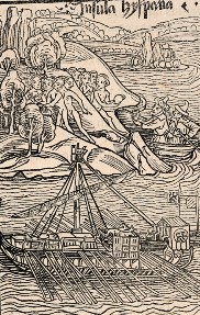One of the most notable similarities between this image and the illustrated frontispieces of Columbus’s letter is the nakedness of the Indians. In the fresco the aborigines appear entirely unclothed, as can be seen in the two leading figures, particularly the one who turns towards the viewer, who as in Columbus’s account is completely naked, with the sole exception of his headdress. The spears sketched in the fresco likewise coincide with those depicted in the illustrated editions of the Admiral’s letter and described in the text of the missive itself.