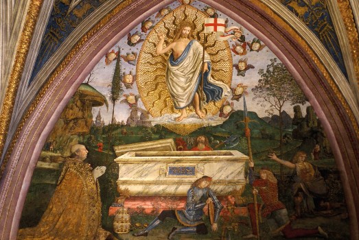 As has been mentioned, Pinturicchio’s Resurrection of Christ is a fresco found in the Sala dei Misteri, one of the Vatican rooms renovated by Rodrigo Borgia after assuming the papacy as Alexander VI in 1492. Although there is no documented evidence of the exact date at which the works began, it must have been somewhere between August 1492, when Rodrigo Borgia was proclaimed Alexander VI, and March 1493, when the Pope wrote a letter to the cathedral of Orvieto where he reports that Pinturicchio was by then already working in the Vatican. It has been argued that Pinturicchio and his workshop must have ended their workbefore the 16th of January of 1495, when the king of France, Charles VIII, was invited by Alexander VI to the Vatican.9