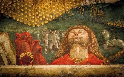 The programme of the Borgia Apartments—as the rooms came to be known after Rodrigo Borgia’s restorations—reflects the Pope’s interest in commemorating the power of his family and his legacy. As Fritz Saxl argues in his essay on the Borgia Apartments, the Sala dei Santi reveals a particular iconography that merges Christian and pagan subjects around the symbol of the bull. This mixture of symbols—which is also present in the frescoes painted on the walls of other chambers—was intended to mirror the Pope’s “constant endeavour to raise [his family] to ever greater power.”10 Indeed, Alexander VI’s constant striving for power is a key determinant of the pictorial programme of the Borgia Apartments. In the Sala dei Misteri, the Resurrection fresco in particular represents the Pope’s political interests and ambitions at the time.