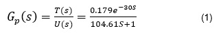 Utilizando la Toolbox Ident de Matlab® y al aproximar la dinámica del proceso de temperatura a un sistema de primer orden con retardo (POR), el modelo resultante es (1):