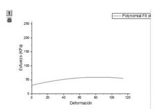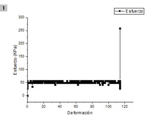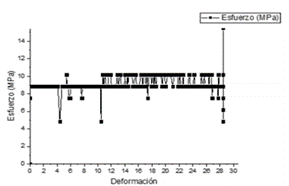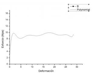 Para conocer el comportamiento del material se eliminó el ruido de adquisición de la máquina de ensayos por medio de una regresión polinomial presentada en la Ecuación 3, lo que permitió obtener la gráfica mostrada en la Fig. 4