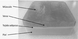El modelo físico se escaló 10:1. Es decir, se manejó un corte de 1 mm x 1 mm equivalente en el modelo a 10 cm x 10 cm. En esta escala la capa de piel tiene un espesor de 1,2 cm aproximadamente, el tejido adiposo un espesor de 1,2 cm, el músculo de 1,5 cm y el diámetro de la vena de 1 cm.