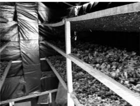 El interior del deshidratador, consta de 6 camas (Fig. 3) distribuidas en dos hileras separadas 80 cm y tres niveles separados 60 cm, inicialmente se distribuyeron 37 kg de material vegetal entre todas las camas.