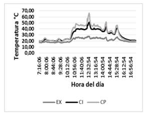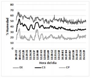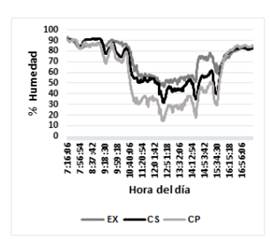 Las curvas obtenidas de humedad y temperatura con carga de 37 kg de plantas aromáticas tipo Menta (Menta Piperita) se muestran en la Fig. 4, para la humedad en el exterior (EX), cámara de precalentamiento (CP) y cámara de secado (CS) e igualmente en la Fig. 5 para la temperatura. El análisis se realiza para los valores tomados entre las 7:16 y las 16:56. Se pueden observar picos mínimos de humedad y máximos de temperatura en las cámaras de secado y precalentamiento, ante pequeños cambios o picos en la humedad y temperatura externa. Estos picos se pueden mejorar al aplicar un control sobre el flujo de aire entre las cámaras y el exterior.