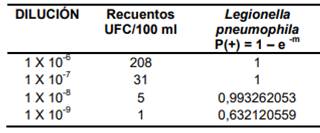 Este parámetro contempla la probabilidad de que la detección del analito sea del 95 %, p (+) = 0,95. Los resultados mostraron que el límite de detección se presentó en la dilución 10-8 para la determinación de Legionella spp. ya que en 10-9 la probabilidad de detección fue menor al 95 %.