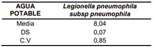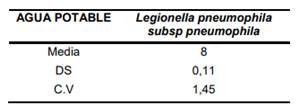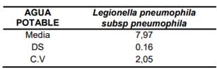 En el análisis inicial de agua potable no se detectó la presencia de Legionella spp. Por lo tanto, se utilizó una concentración conocida de la cepa de Legionella pneumophila subsp. pneumophila como inóculo de los ensayos posteriores.