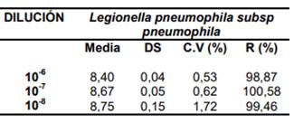 Este parámetro se determinó a partir de la comparación de dos matrices distintas, como agua potable y caldo peptonado al 0,1 %. Para cada matriz se evaluaron las diluciones 10-6, 10-7, 10-8 y 10-9, las cuales fueron inoculadas con Legionella pneumophila subsp. pneumophila partiendo de una solución McFarland de concentración 1. Cada dilución se procesó 15 veces, excepto la última, la cual se filtró por triplicado.