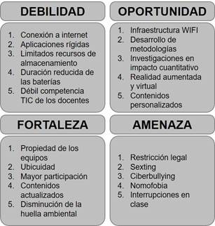 En este orden de ideas, existen diferentes posturas frente al M-Learning, existen debilidades frente a su implementación como: conectividad a la red debe ser constante, las baterías de los dispositivos no duran mucho tiempo, existen aplicaciones complejas para administrar, y el bajo nivel de competencias TIC de los docentes [57]. Por otro lado, se establece la existencia de amenazas asociadas al uso excesivo e intensivo de los móviles como el estrés, insomnio, sexting, nomofobia, entre otras [58]. Pero lo negativo con la implementación del aprendizaje móvil [59], podría desencadenar el desarrollo de tecnológico, mejorar los entornos educativos en línea, el desarrollo de metodologías emergentes, es decir, aumentar las investigaciones del aprendizaje personalizado y experiencias inmersivas por medio de la realidad aumentada y virtual, a demás de las fortalezas asociadas a la educación mediada por la tecnología móvil. En la Figura 1, se resume en una matriz DOFA (debilidades, oportunidades, fortalezas y amenazas) las diferentes posturas de la implementación del M-Learning.