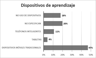 Así mismo, en la Figura 2 se presenta el tipo de dispositivos móviles utilizados en los procesos de enseñanza aprendizaje en diferentes experiencias relacionadas con los dispositivos móviles [62], reflejando que el 47% de los estudios usaron dispositivos móviles tradicionales, el 4% usaron tabletas, el 11% usaron teléfonos inteligentes, 20% no limitaron los tipos de dispositivos, mientras que el 18% no usó dispositivos, lo que indica que esos estudios son en un alto porcentaje teóricas.