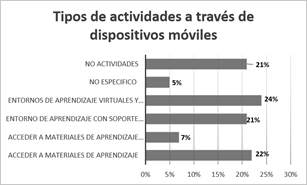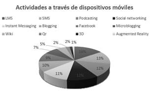 Del mismo modo, se realizó una revisión literaria sobre el impacto del programa BYOD (Bring your own device), “trae tu propio dispositivo” en la educación superior [63] en el cual se logra extraer información importante frente a las actividades educativas que realizan los estudiantes a través de los dispositivos móviles. En la Figura 4 se logra apreciar una interacción mayor de los estudiantes por medio de sus móviles en los LMS institucionales (15%), seguido de la interacción por medio de SMS (13%), las redes sociales y el poscasting tienen porcentajes similares (12%), en este orden continúa la mensajería instantánea (11%), blogging (10%), Facebook (9%), microblogging (7%), wikis (5%), códigos QR (2%), objetos en 3D (2) y por último la realidad aumentada (1%).