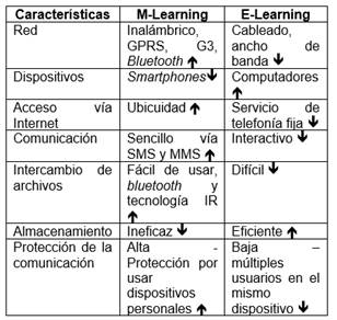 Es así como el modelo M-Learning presenta oportunidades para otros entornos de aprendizaje como los MOOC, pues permitiría mayor participación y alcance, sin embargo, tiene dificultades para ser competitivos frente a los ambientes de escritorio, ya que la interacción se limita en el manejo de multitareas, pantallas reducidas, almacenamiento y teclado [60]. Al respecto se propone que estos limitantes vislumbran una oportunidad de articulación del M-Learning con el aprendizaje electrónico (e-learning) [61], es decir, que estos modelos no deben competir entre ellos, sino buscar lo mejor de cada uno para ofrecer experiencia de aprendizaje ricas en contenidos y reducir la dependencia de las conexiones a Internet, a través del desarrollo de aplicaciones offline. En la Tabla 1, se presentan las características de los dos modelos presentada por [61] en donde se resaltan como aspectos positivos las flechas hacia arriba y los aspectos negativos las flechas hacia abajo.