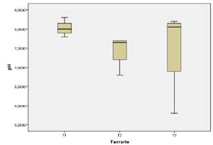 El rango de humedad de los terrarios estuvo entre 10-50% sin diferencias significativas (p= 1,166, p>0,05), manteniéndose en un porcentaje óptimo de 6-22% según Ecopetrol (23). Se presume que la frecuencia del riego y el material de excretas de ganado ayudaron a mejorar la capacidad de retención de humedad del suelo y controlar la variación de la temperatura. La humedad óptima para el crecimiento microbiano está entre el 50-70%; la actividad biológica decrece mucho cuando la humedad está por debajo del 30%; por encima del 70% el agua desplaza al aire en los espacio libres existentes entre las partículas, reduciendo la transferencia de oxígeno y produciéndose una anaerobiosis. Cuando las condiciones se hacen anaerobias se originan malos olores y disminuye la velocidad del proceso (24). El agua es el principal componente del protoplasma bacteriano y su suministro es esencial para el crecimiento y mantenimiento de los microorganismos (25). El contenido suelo-agua influye en la aireación (transporte de oxígeno), en la solubilidad de los constituyentes del suelo y en el pH (26). Poca humedad en el suelo da como resultado zonas secas y por lo tanto poca actividad de los microorganismos. Sin embargo demasiada humedad inhibe el intercambio de gases y da como resultado el desarrollo de zonas anaerobias y como consecuencia la eliminación de bacterias aerobias y el incremento de anaerobias facultativas (27). El pH durante el tiempo de biodegradación presentó poca variabilidad en los diferentes terrarios, con valores en el rango de 5,80 y 8,30, observándose mayores valores en el terrario No 1 indicado la favorabilidad de la excreta de ganado vacuno (Figura 1). Se observó un incremento.