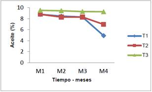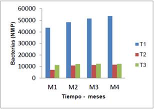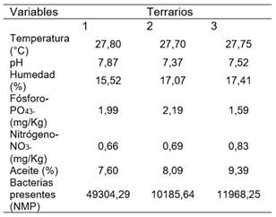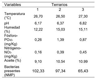 Situación que contrasta con el aumento en el crecimiento bacteriano(Figura 4) y la disminución de la concentración de aceite (Figura 5), las cuales se presentaron sin diferencias significativas (p = 0,992 y p = 0,250; p > 0,05), en los tres terrarios durante el transcurso del tiempo de degradación. Se observa mayor crecimiento bacteriano en el terrario No 1 al igual que la mayor disminución de la concentración de aceite, lo cual pudo haber sido consecuencia de las mejores condiciones de humedad, pH y disponibilidad de nutrientes (N y P), presentadas en dicha unidad de biodegradación.