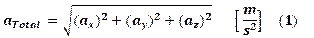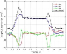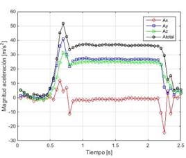 El código implementado en el Arduino permitió obtener directamente la aceleración en los tres ejes coordenados. La orientación de cada aceleración y la ubicación del acelerómetro se pueden evidenciar en la Fig.3 A partir de estas variables se puede obtener la magnitud de la aceleración total como se muestra en la ecuación 1.