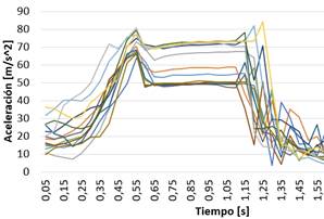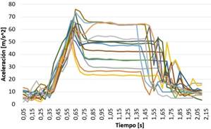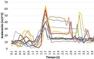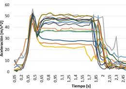 En el lanzamiento elevator pass realizado por un jugador no entrenado (ver Fig.11), tiene diferencias apreciables en los diferentes intervalos de tiempo y aceleración expuestos en la tabla 4.