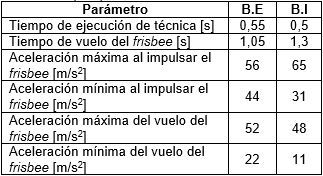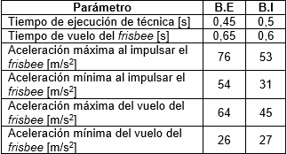 Tabla 3. Comparación de parámetros de los lanzamientos backhand realizados por un jugador entrenado (B. E.) y un jugador no entrenado (B. I.).