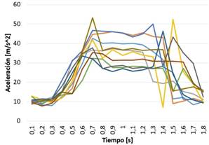Para contrastar los resultados de los lanzamientos de un jugador inexperto con un jugador entrenado, se realizaron varios ensayos con las mismas restricciones. El comportamiento de los lanzamientos backhand mostrados en la Fig. 10 tienen diferencias en los intervalos de tiempo como en aceleraciones, respecto a un jugador entrenado. En la tabla 3, se pueden identificar los parámetros más relevantes de los resultados.