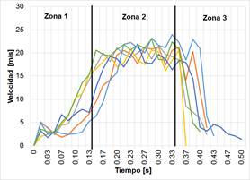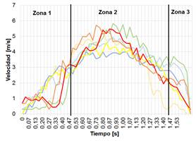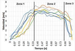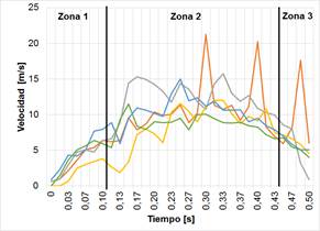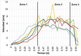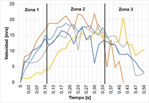 Por medio del análisis de imagen, se obtienen las siguientes gráficas para cada tipo de lanzamiento, en las que se aprecian las divisiones de zonas. La zona 1 comprende el transcurso de tiempo en el cual el lanzador está generando el momento de fuerza para liberar el disco, en la zona 2 se presenta la velocidad total del vuelo del frisbee y por último en la zona 3 se muestra la velocidad total en el transcurso de tiempo cuando es atrapado el disco. La distancia entre el lanzador y el receptor es de 4 metros.