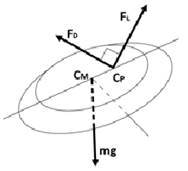 Por último, se encuentra que el momento angular es proporcionado por el impulso que el jugador realiza sobre el disco. El momento angular es el encargado de brindarle estabilidad al frisbee y de que pueda atravesar una mayor distancia a través de las corrientes de aire. Este es causado por la diferencia entre el centro de masa (CM) y el centro de presión (CP). El centro de masa es el punto donde el peso del frisbee se concentra y el centro de presión es donde actúan las fuerzas aerodinámicas [7][8]. La distribución esquemática de las fuerzas se puede ver en la Fig.1.