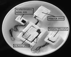 La selección de los componentes electrónicos tuvo como principales criterios la facilidad de montaje e información disponible, los costos y la disponibilidad en el mercado. El resultado obtenido fue la elección de un Arduino UNO, un acelerómetro ADXL 335, una tarjeta MicroSD y como fuente de energía pilas CR 2032.