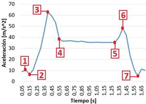 En general, se encontraron comportamientos similares en las gráficas de aceleración total de los lanzamientos backhand y forehand. En la Fig.5 se muestra un lanzamiento específico que ejemplifica estos comportamientos. Analizando e interpretando los videos de los lanzamientos y comparándolos con las gráficas obtenidas con el montaje electrónico, se encontró que entre el punto 1-2 el lanzador lleva el frisbee hacia atrás para empezar el lanzamiento. Luego entre 2-3 el jugador impulsa el disco hacia adelante hasta llegar al punto 3 que corresponde a la aceleración máxima que el jugador alcanza cuando realiza la aducción de la muñeca, generando la rotación del frisbee, a partir de este punto la aceleración decrece hasta el punto 4 debido a que el lanzador no suelta inmediatamente el disco. Entre 4-5 está comprendido el vuelo del disco cuya extensión y comportamiento depende fuertemente del tipo de lanzamiento. Entre 5-6 se presenta un pico de aceleración que es causado por el impacto y la reacción del jugador para atrapar el disco y a partir de 6 se desacelera completamente el frisbee.