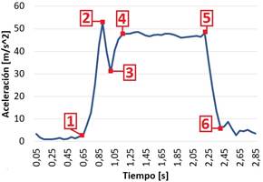El comportamiento de la aceleración del lanzamiento elevator pass difiere de los demás. En la Fig.6 se muestra la gráfica de un lanzamiento específico que ejemplifica el comportamiento general. La primera diferencia identificada, es que en la técnica no se necesita generar un impulso relevante hacia atrás, debido a que la distancia para este lanzamiento es muy corta, por lo que la figura no presenta un descenso en la aceleración. Entre 1-2 se genera el impulso del frisbee hacia adelante, a partir del punto 2 el jugador desacelera el movimiento, con la finalidad de que entre 3-4 el jugador logre realizar la aducción de muñeca y al mismo tiempo realizar el movimiento para que el frisbee ascienda. Entre 4-5 en esta comprende el vuelo del disco. En el punto 5 se ejecuta la atrapada del disco y al igual que en la Fig.5 se puede dar un pico que dependerá de la atrapada. Finalmente, entre 5-6 se desacelera el frisbee.