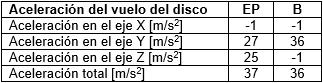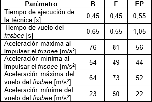 Analizando las Fig.7, Fig.8 y Fig.9, se observa que en general la tendencia es similar en cada una, pero se encuentran diferencias en los tiempos de ejecución de la técnica y en la permanencia del frisbee en vuelo. En la tabla 2 se muestran los tiempos y aceleraciones más relevantes. Estos fueron obtenidos promediando los 14 lanzamientos de cada tipo de lanzamiento, siendo backhand (B), forehand (F) y elevator pass (EP).