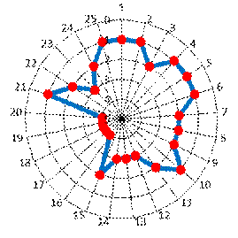 Otra forma de visualizar los datos es mediante la utilización del denominado “gráfico de diana” el cuál puede ser más efectivo en términos de interpretación de la infromación. En la Fig. 1 se presenta cada uno de los elementos de una matriz ACVR arbitraria en la que cada uno de los elementos es graficado a un ángulo específico (para una matriz de 25 elementos, el espacio angular es de 360/25=14.4°)