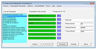 En la Fig. 2 se presenta una captura del menú de selección de la herramienta en donde se observa el ranking de los candidatos. Este resultado está de acuerdo a la literatura que sugieren la utilización de paneles de PC cuando son usados en exteriores debido a su buena resistencia UV y al desgaste [28]. Como se observa en la figura, el menú permite el ingreso de hasta 7 propiedades diferentes al momento de la selección (a partir de la lista de propiedades). El ingreso se realiza a través del botón “Insertar”. El botón “Resultado” permite correr el algoritmo interno para encontrar la selección. El botón “Cancelar” permite salir de la selección, mientras que el botón “Borrar” elimina las entradas de las casillas para realizar de nuevo el ingreso de propiedades y de ponderaciones.