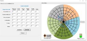 En la Fig. 3 se presenta la matriz y el grafico de diana correspondiente para la teja hecha en PC. El ingreso de los valores de la matriz se realiza de forma individual en cada elemento. El botón “Calcular” permite obtener los totales en ambas direcciones, tanto por etapa de vida como por impacto ambiental, además tiene como salida el valor del Rerp del material. El botón “Graficar” realiza el gráfico de dianas a partir de los valores de la matriz. Allí se observa más claramente la tendencia hacia el centro de casi todas las etapas a excepción de la extracción de fuentes. En dicha etapa se considera que la mayoría del material requerido es virgen, hay impacto en el uso de energía debido a procesos de destilación, desechos sólidos producidos en refinerías, residuos líquidos que pueden contaminar y emisión de gases de efecto invernadero.