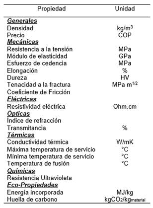 Las propiedades que se consideraron en la herramienta de selección se listan en la Tabla 1, y entre ellas se incluyen: generales, mecánicas, eléctricas, ópticas, térmicas y eco-propiedades.