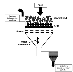 Gravity concentration describes the gradual removal of heavy minerals from the ganga through mechanical processes for industrial usage. Typically, a gravity concentration plant (GCP) includes a primary treatment (physical separation) and a secondary treatment to recover the valuable mineral [1]. Primary treatment consists of a chain of gravity concentration devices as a Jig (see Fig. 1. [1]) where mineral particles move relatively in a pulsating water flow resulting in a stratification of particles of different densities and sizes [2]. Due to the ever increasingly stringent requirements imposed by mining legislation [3], control of effluent standards requires refined and sophisticated process design able to minimizing environmental contamination to water sources.