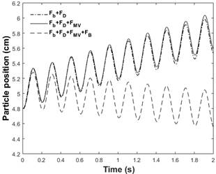 Virtual mass force and Basset force affect significantly particle trajectories inside the jig chamber. Finally, it could be demonstrated from Fig. 8, that neglect these forces on particle motion model for pulsating beds not generate a good explanation of the phenomenon of solid-liquid interaction in gravimetric concentrations device.