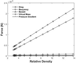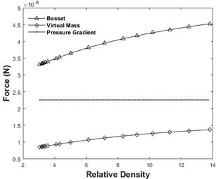 Fig. 5 shows that for the density ranges considered in this study, the Basset force is more significant than the virtual mass force and pressure gradient force. Also from Fig. 5 one can see that as the density increases, Basset force and virtual mass force varies exponentially, significantly influencing particle motion and their subsequent concentration.
