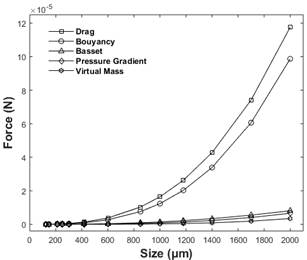 The relative magnitudes of different forces are compared in Fig. 4 for all particles with a constant relative density value of RD=3.42 and keep other parameters constant. The size range is 125 µm to 2000 µm. As shown in Fig. 4, the drag force and buoyancy force are still the dominant forces with an exponential relationship with size. However, it should be noted that Basset, added mass and pressure gradient might increase to about 10% of the drag force for some particles sizes (125 µm < d< 600 µm).