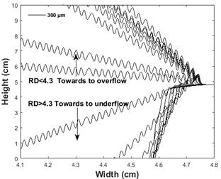 When Basset force is included, particle oscillations amplitude decreases while the longitudinal displacement increases causing that the particle resident time increases inside chamber jig. From Fig. 7 and Fig. 8 is observed that particles with RD ≤ 4.3 will be reported directly in the overflow while the particles with RD > 4.3 fall to jig bed and will be reported in the concentrate stream.