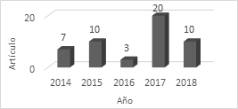 El número de artículos publicados sobre LM presentan un crecimiento en los últimos cinco años. Del año 2014 a 2015 el número de trabajos sobre el tema pasó de siete (7) a diez (10), y en el 2017 se desarrollaron veinte (20) trabajos. Lo que muestra que el uso y aplicación de las herramientas Lean se ha tornado un factor importante en desarrollo de las industrias.