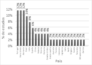 De acuerdo con la revisión de la literatura, se encontró que en los últimos cinco años se han desarrollado estudios sobre Lean en 24 países. En la Fig. 2, se ilustra el porcentaje de investigaciones que se han efectuado por país. En Portugal, el Reino Unido y Alemania se han desarrollado el 12% de las investigaciones respecto a Lean, respectivamente, siendo estos los países que más presentan avances en investigación; en Brasil se ha desarrollado el 10% de los estudios, siendo el cuarto país con más publicaciones sobre Lean; en la India se ha realizado el 8% y en España el 6% de las investigaciones sobre el tema; en países como China, Malasia, Polonia, Rumania y Estados Unidos se ha realizado el 4% de los estudios, respectivamente; entre los países que menos desarrollan investigaciones sobre Lean, están Arabia saudita, Australia, Francia, Indonesia, Inglaterra, Italia, Japón, Singapur, Suecia, Tailandia, Witwatersrand y Zambia. Esto no quiere decir que los aportes en investigación no sean importantes, lo que muestra es que, en estos países existe menor interés en desarrollar estudios relacionados con la filosofía.