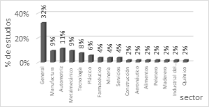 Por otra parte, es importante tener en cuenta los sectores en los que se desarrollan las investigaciones respecto a Lean (ver Fig. 3); el 32% de los autores consultados no indican el sector específico en los que desarrollaron el análisis, aunque muestran avances importantes respecto a Lean; el 9% de los autores manifiestan que los trabajos fueron desarrollados en empresas de manufactura sin especificar el tipo de producto que se procesa; el 11% de los autores desarrollan aplicaciones y estudios en la industria automotriz, siendo este el sector en el que más se aplica la filosofía Lean; el 9% desarrollan investigaciones en la industria metalmecánica; el 8% estudia las empresas de tecnología; el 6% realiza investigación en industrias del sector plástico; el 4% realiza aplicaciones en los sectores de la minería, farmacéutico y de servicios, respectivamente. Los sectores en los que menos se desarrollan investigaciones respecto a Lean son el de la construcción, el aeronáutico, el alimenticio, el peletero, el maderero, la industria del color y la química, lo que representa un potencial para el desarrollo de lean en este tipo de empresas.