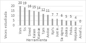 Se analiza la aplicación de catorce (14) herramientas consideradas esbeltas. En la Fig. 4, se ilustran las herramientas y el número de veces que se han estudiado de acuerdo con las cincuenta (50) referencias consultadas.
